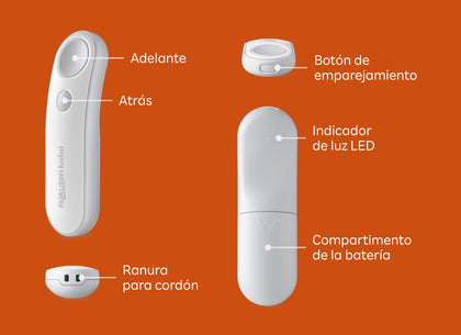 Kobo Remote te mantiene en la historia, sin interrupciones. Diseñado en exclusiva para los eReaders Kobo, sus controles intuitivos permiten pasar página sin esfuerzo con un simple clic. Mantén tu ritmo de lectura sin levantar un dedo. Con un diseño cómodo y ergonómico y una batería de larga duración, Kobo Remote es el compañero de lectura perfecto.